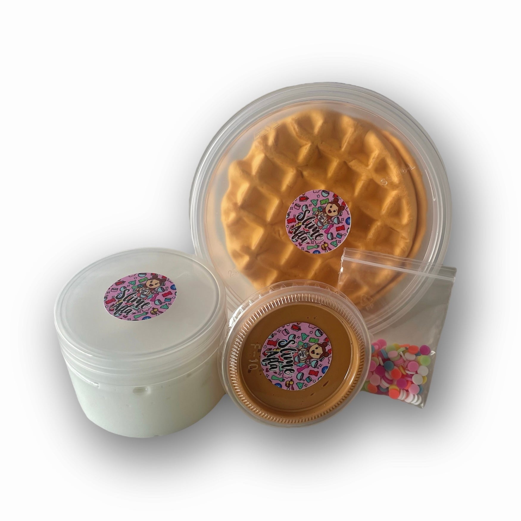 Slime + figura moldeable de waffle para mezclar + slime café + fimos de colores CON AROMA A CARAMELO 🍭